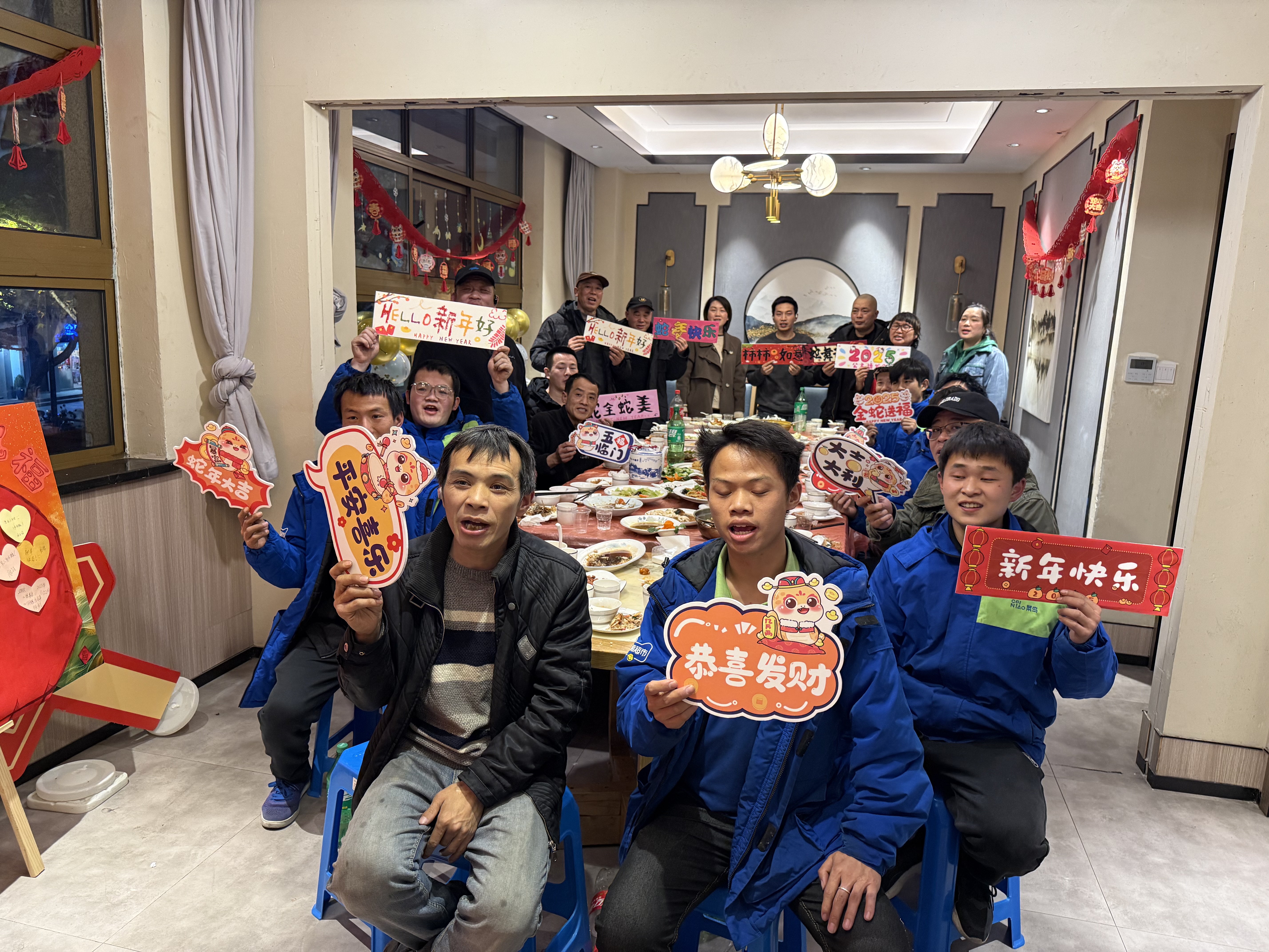 盐焗鸡、东坡肉、清蒸鲈鱼、小炒肉……当丰盛的菜品搭配一盘盘热气腾腾的饺子端上桌,浓浓的年味扑面而来。现场,红色桌布将食堂装点的格外温暖,每一处布置都精心点缀,散发着节日的欢乐气氛。“快递骑手”们围坐在年夜饭餐桌上,社区负责人向到场快递骑手们送上新春祝福。大家纷纷举起手中的饮料,为过去一年的汗水与付出深情碰杯,更为新的一年的希望与梦想加油鼓劲。小哥们也许下了新年愿望。“希望新的一年顺顺利利!”“我希望收入越来越高,生活越来越好!”