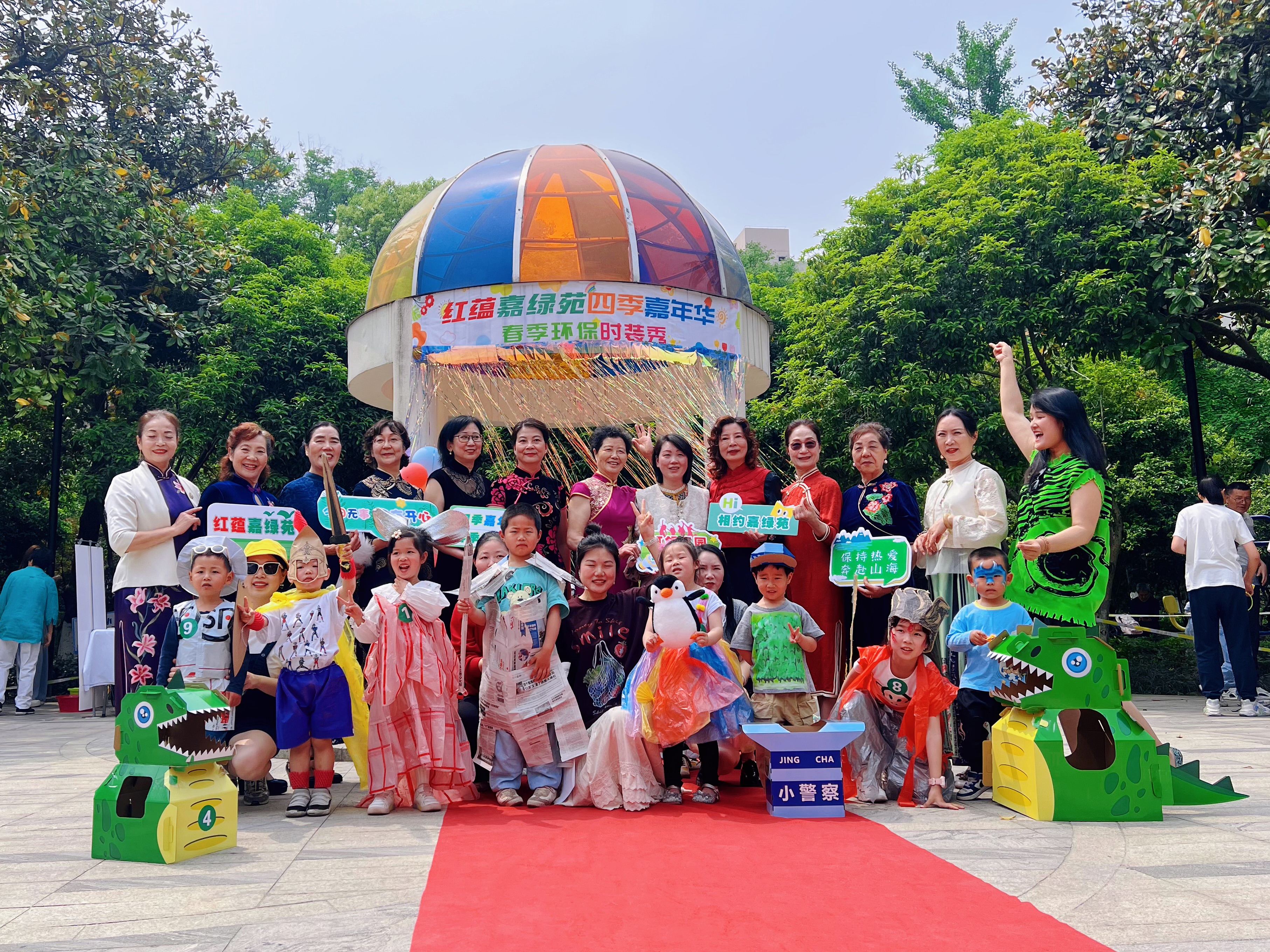 活动现场,小朋友们的环保时装秀成为焦点。萌娃们化身“环保小设计师”,将废旧纸箱、快递包装、塑料布等材料用心改造,小警察、恐龙父子、斯巴达勇士、仙女公主等造型轮番登场,稚嫩步伐中洋溢着对环保的独特理解。“我妈妈可会买东西啦,家里经常看到快递员叔叔,我的‘快递服’是用叔叔送快递的盒子做的,快递小哥很辛苦,我们要爱护他们的劳动成果!”童言童语间,既展现了变废为宝的巧思,也流露出对快递员等新就业群体的理解。旗袍队阿姨们紧随其后,身着锦绣旗袍步步生莲,古典风韵与童趣创意交相辉映,赢得阵阵掌声。