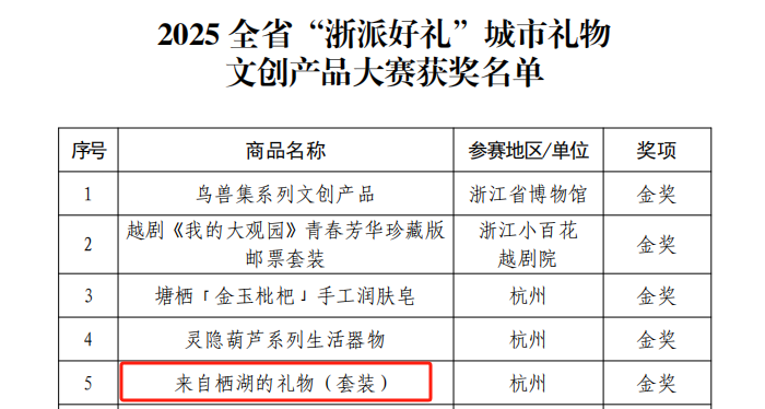 近日,由省文旅厅主办的2025“浙派好礼”城市礼物文创产品大赛暨中国旅游商品大赛成果揭晓,西湖区转塘街道送的“来自栖湖的礼物(套装)”斩获金奖。