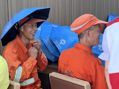 活动现场,20余名环卫工人和快递小哥从志愿者手中接过了崭新的遮阳伞。橙色的工作服与蓝色的爱心伞交相辉映,构成一道温馨的风景线。“领到这份礼物特别有意义。”环卫工人李大姐笑着说,她和同事们每天凌晨4点就开始作业,在高温下坚守岗位,“这把伞不仅能遮阳,更让我们心里暖暖的。”快递小哥陈海峰表示:“我们整天在外奔波,这伞轻便又结实,很实用!”