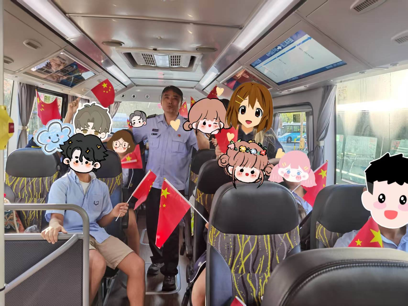 当天下午,随着放学铃声响起,学子们像往常一样登上求知专线。令大家惊喜的是,司机郑建锋师傅早已准备好一批小国旗,逐一递到每个孩子手中。接过国旗的瞬间,车厢里立刻热闹起来:有的学子轻轻展开国旗贴在车窗上,有的互相挥舞着国旗问候,清脆的祝福声在车厢内不断回荡,原本普通的放学路,瞬间变成了充满仪式感的“国庆祝福专线”。