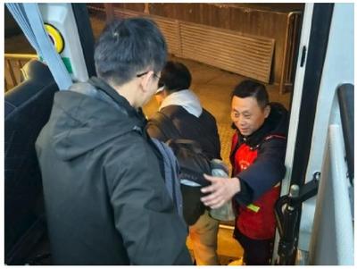 接驳专线运行期间,公交车辆准时停靠在院校指定乘车点位,让学子们出校门就能上车,免去了拖着行李奔波的麻烦。在乘车现场,公交志愿者全程在岗,主动上前为学子搬运行李、协助摆放整齐,还反复提醒乘车安全事项,用细致的服务化解学子的出行顾虑。无论是午后离校的集中高峰,还是深夜返程的零散学子,接驳专线的车辆始终准时待命,明亮的车灯照亮学子归乡路,志愿者的贴心服务让冬日的归途暖意融融。这条接驳专线全程一站直达杭州火车东站,无需换乘、不用绕路,让学子们得以轻装上阵,安心奔赴归乡旅程。