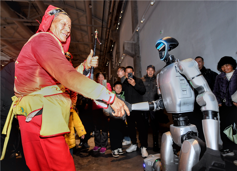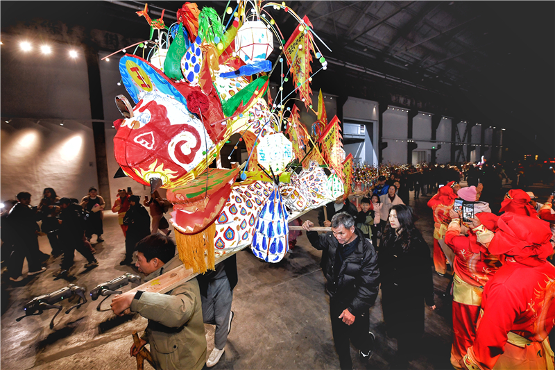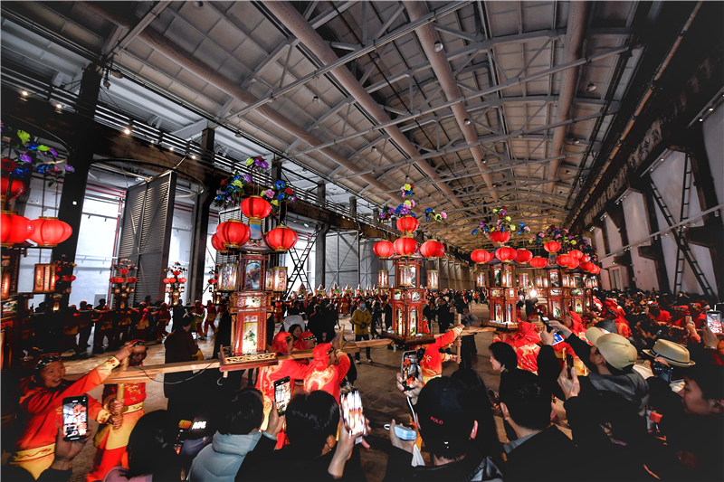 龙灯游走的轨迹,串联起整个园区的灯火。在另一侧的广场上,非遗“打铁花”正在上演。滚烫的铁水被击向高空,在工业厂房的锯齿形屋顶下炸裂开来,化作漫天星辰倾泻而下,引来阵阵惊呼。带着父母来逛的市民王女士感叹:“老厂房、铁花雨,还有旁边走来走去的机器人狗,这种感觉太穿越了,传统和未来一下子都有了。”