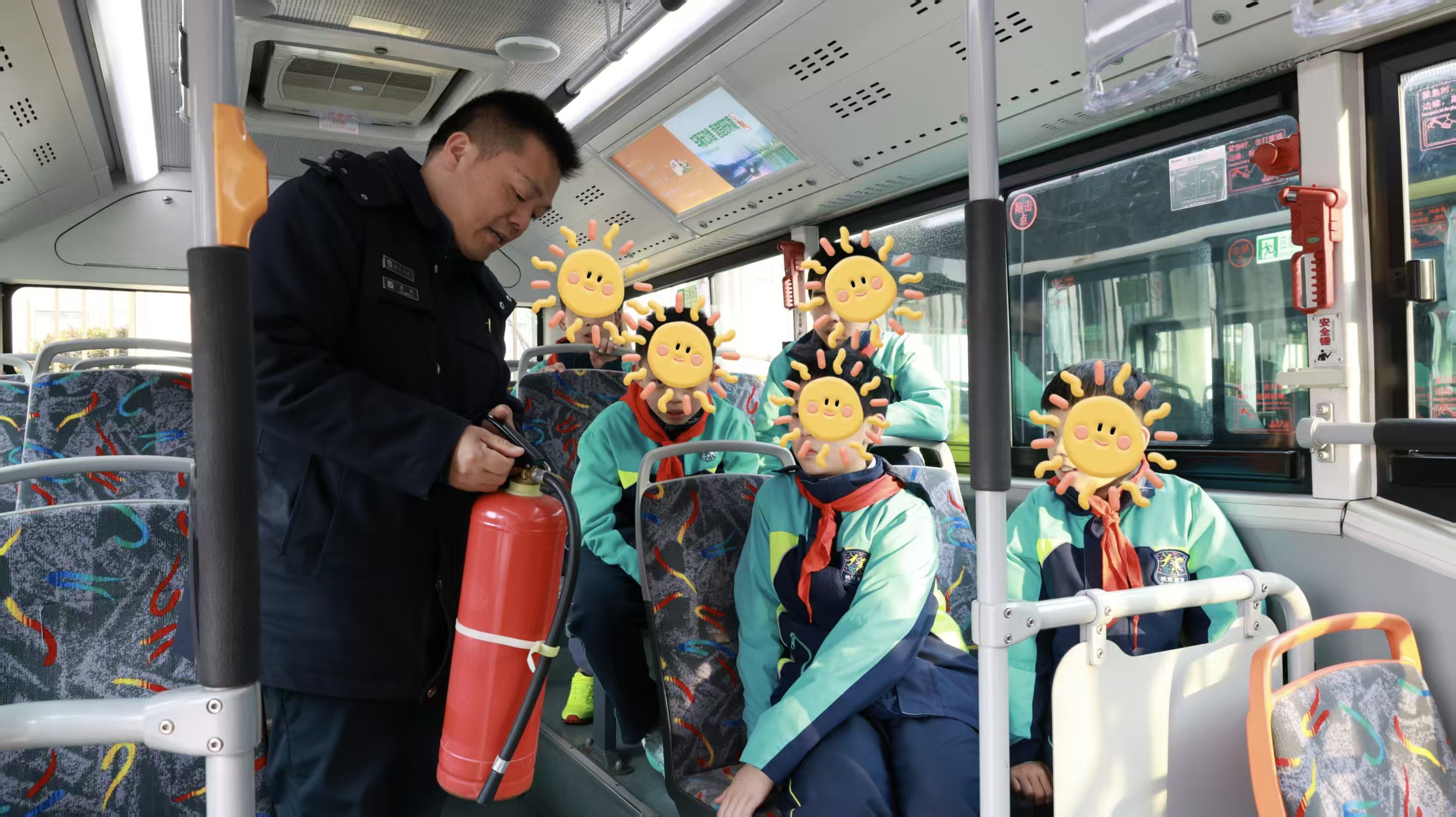 除了劳动实践与志愿服务,这场实践课还为同学们准备了干货满满的公交安全专题培训。车队安全管理员结合公交运营中的真实案例,用生动易懂的语言,系统讲解了日常乘车规范、文明乘车礼仪,以及车辆突发状况下的应急处置流程与逃生技巧。现场,管理员还手把手指导同学们正确操作安全锤、车载灭火器等应急设备,把书本上抽象的安全知识,转化为可操作、能掌握的实用技能。同学们全程专心聆听、踊跃互动、积极提问,在沉浸式的学习体验中,牢牢筑牢了出行安全的思想防线。