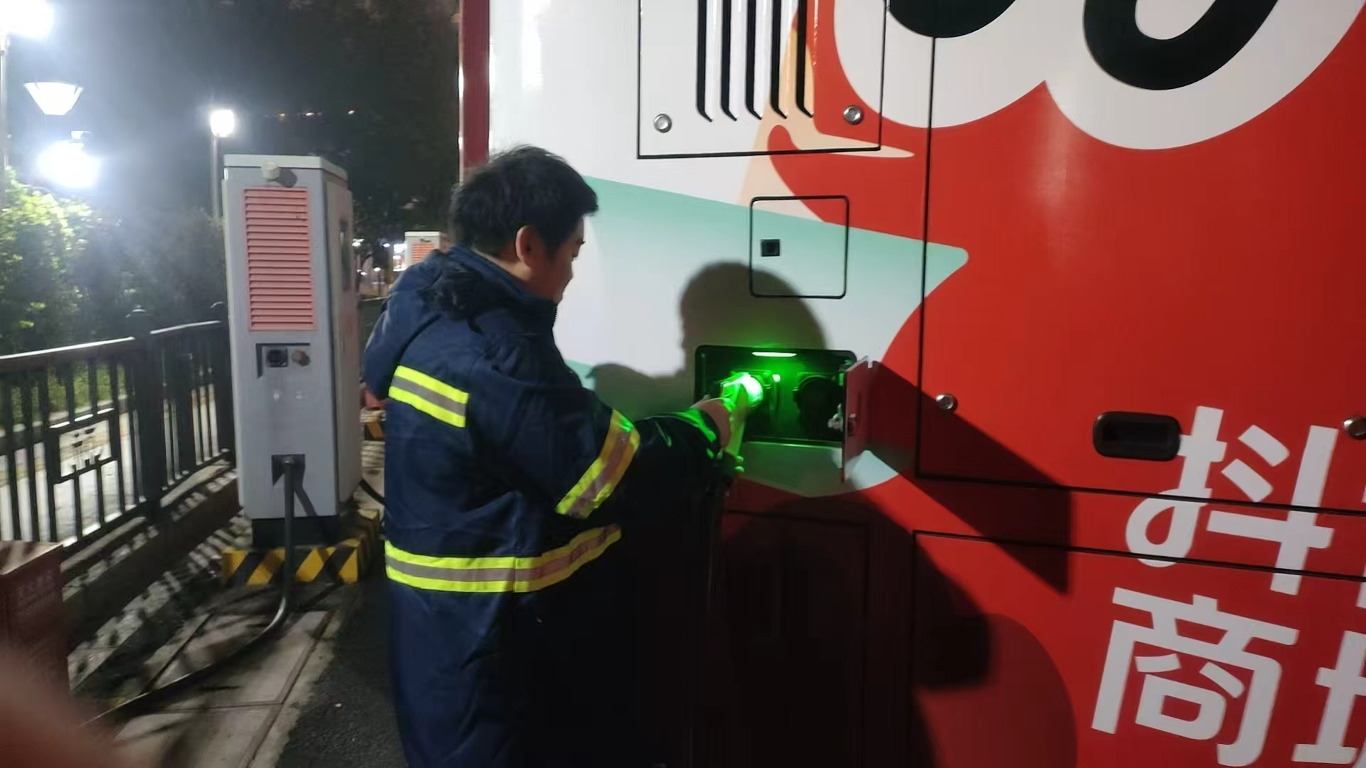 “夜里干活,最不能有的就是侥幸心理。要是充电环节出了问题,早上的班车发不出去,耽误的是全线路市民的出行计划。”朱良手持手电筒,沿着车位逐排巡查,光束扫过每一块设备屏幕、每一个充电接口,屏幕上的电流、电压数据,接口的连接松紧度,都要一一核对确认,丝毫不敢懈怠。